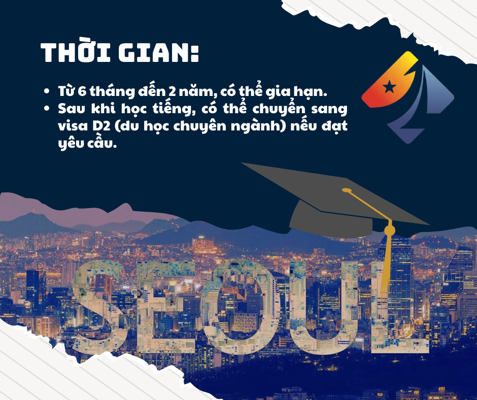 - Thời gian học: Visa D4-1 cho phép người nước ngoài học tiếng Hàn tại Hàn Quốc trong thời gian từ 6 tháng đến 2 năm, tùy thuộc vào khóa học và trình độ tiếng Hàn của học viên.